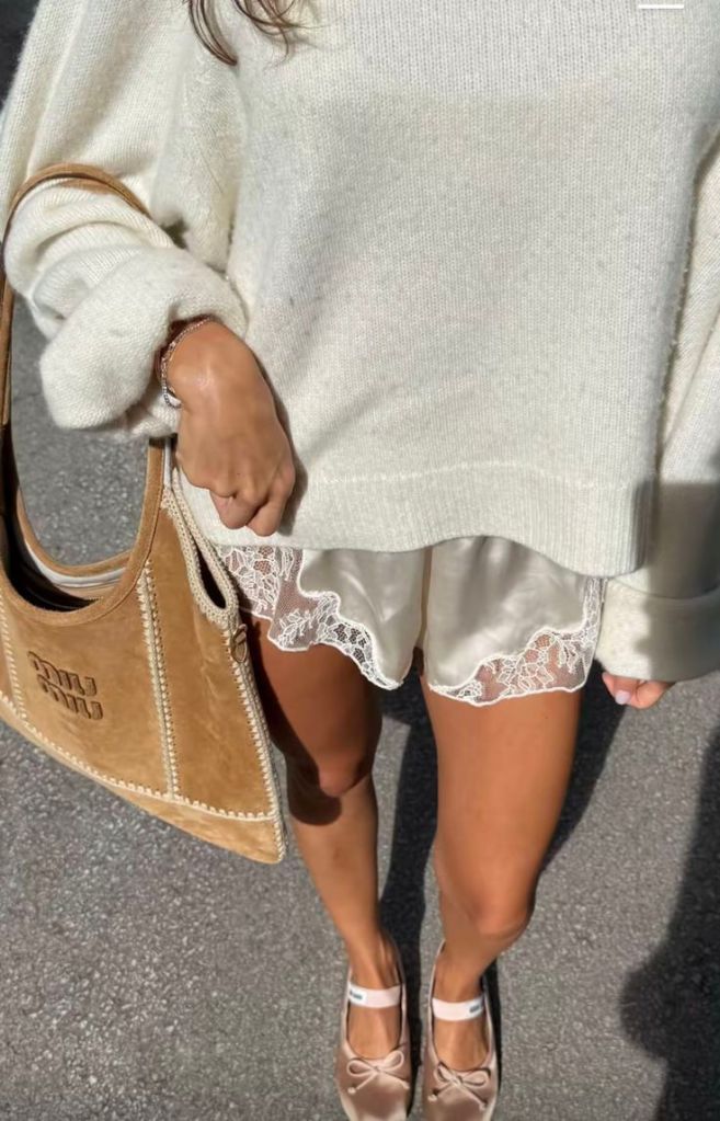 I’m all about oversized, loose fits for comfort, especially with a toddler in tow. But one day, I’d love to try a cozy sweater over a lace-insert satin skirt for a mix of comfy + chic.