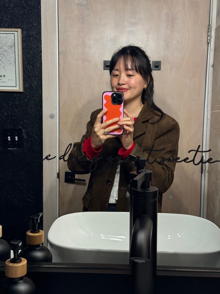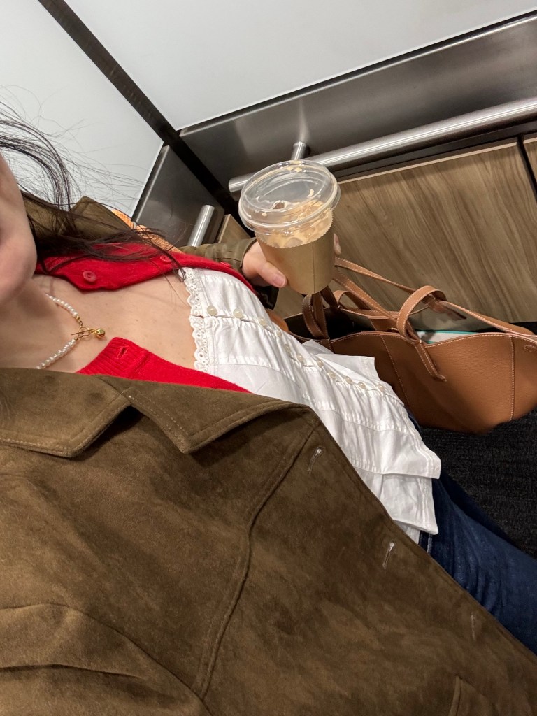 아우터는 Oak + Fort 스웨이드 블레이저를 매치했고, 하의는 Mango에서 산 와이드 스트레이트 레그 진을 입었어요.