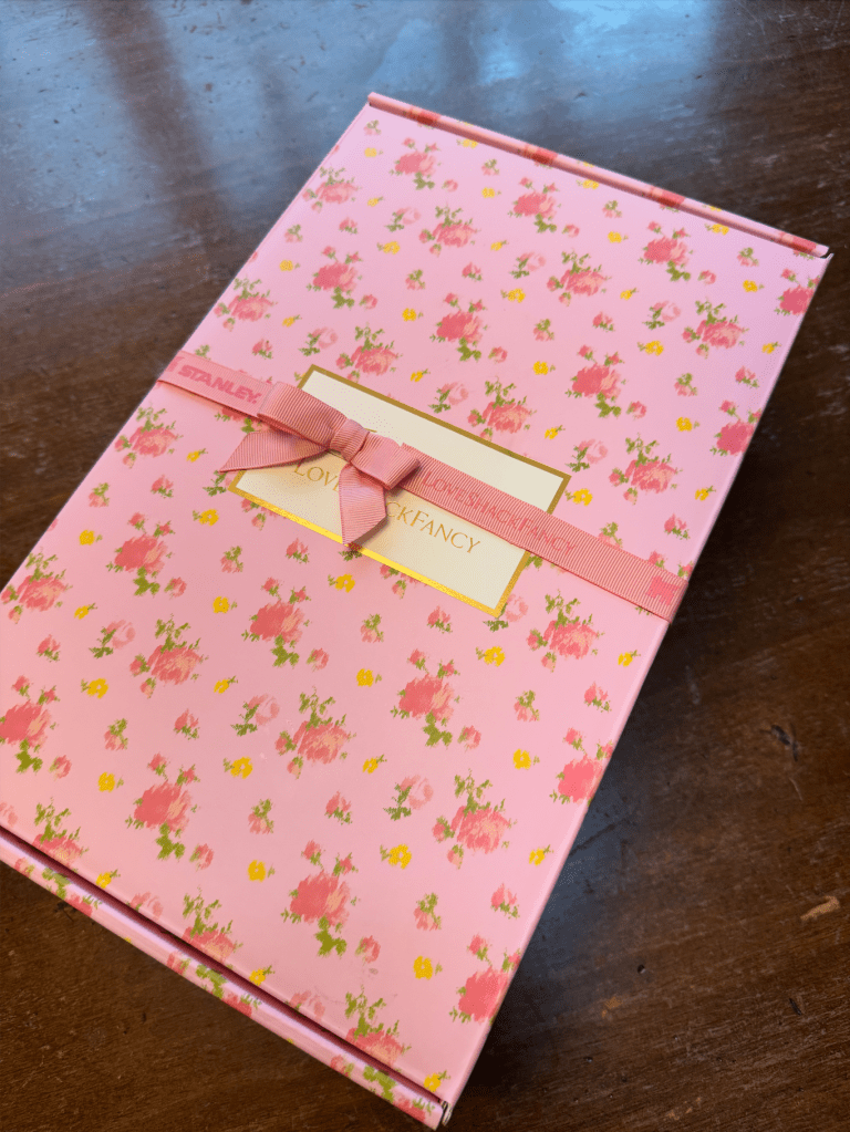 I had kept this Stanley x Love Shack Fancy collaboration tumbler box https://shorturl.at/yugFF for a while because it was just too pretty to throw away — the pink floral design is so lovely that it made the perfect gift box.